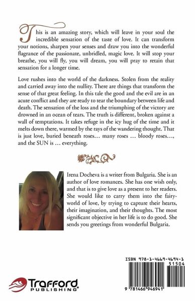 This is an amazing story, which will leave in your soul the incredible sensation of the taste of love. It can transform your notions, sharpen your senses and draw you into the wonderful flagrance of the passionate, unbridled, magic love. It will stop your breath. You will fly, you will dream, you will pray to retain that sensation for a longer time. Love rushes into the world of the darkness. Stolen from the reality and carried away into the nullity. There are things that transform the sense of that great feeling. In this tale, the good and the evil are in an acute conflict, and they are ready to tear the boundary between life and death. The sensation of the loss and the triumphing of the victory are drowned in an ocean of tears. The truth is different, broken against a wall of temptations. It takes refuge in the icy hug of the time, and it melts down there, warmed by the rays of the wandering thought. That is just love, buried beneath roses . . . many roses . . . bloody roses . . . , and the sun is . . . everything.