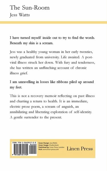 Jess was a healthy young woman in her early twenties, newly graduated from university when she was struck down with Chronic Fatigue. Here she writes of a lost past and a halted present in which despair rotates with hope. It will speak to anyone who is stalled because of chronic illness or ill health.This is not a ME memoir or a journey back to health but a vivid description of an uncertain present and a future that us not known. The Sun- Room cuts through the pain of losing yourself to chronic illness to reveal an angry, envious, devastated, and sun- soaked core. It is a scream of anguish. An annihilating and liberating exploration of self-identity. A gentle surrender to the present.