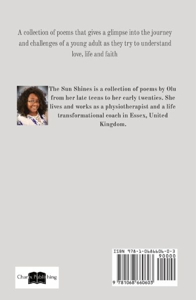 The Sun Shines is a collection of some of the poems written by Olu in her late teens and early twenties. Olu lives and works as a physiotherapist and life transformational coach in Essex, United Kingdom.