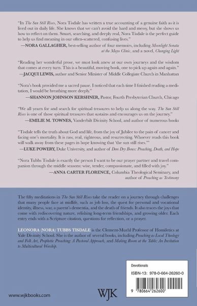 For many people at midlife the pace of life is so frenetic and full that we do not take the time to "let the land lie fallow." But it is especially at this juncture that many want to ask some hard questions of God and of ourselves. Leonora Tubbs Tisdale presents this devotional book of reflections to help people at midlife reflect and navigate through some of these questions. The fifty meditations in The Sun Still Rises take the reader on a journey through challenges that many people face at midlife, such as job loss, the quest for personal and vocational identity, illness (cancer), war, a parent's dementia, and the death of friends. It also traces the joys that come with rediscovering nature, relishing long-term friendships, and growing older. Each entry ends with a Scripture citation and questions for reflection.