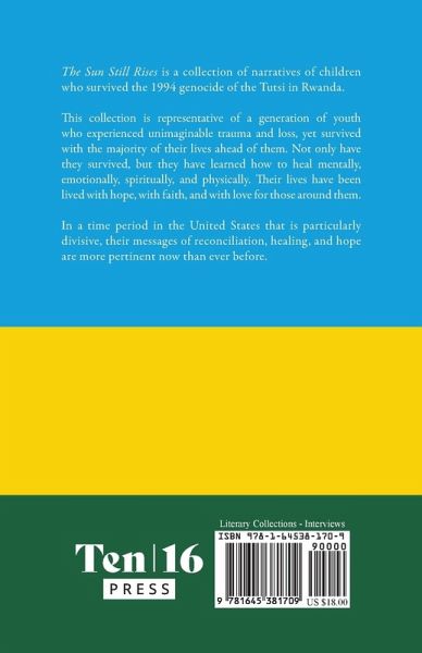 The Sun Still Rises is a collection of narratives of children who survived the 1994 genocide of the Tutsi in Rwanda. This collection is representative of a generation of youth who experienced unimaginable trauma and loss, yet survived with the majority of their lives ahead of them. Not only have they survived, but they have learned how to heal mentally, emotionally, spiritually, and physically. Their lives have been lived with hope, with faith, and with love for those around them. In a time period in the United States that is particularly divisive, their messages of reconciliation, healing, and hope are more pertinent now than ever before.
