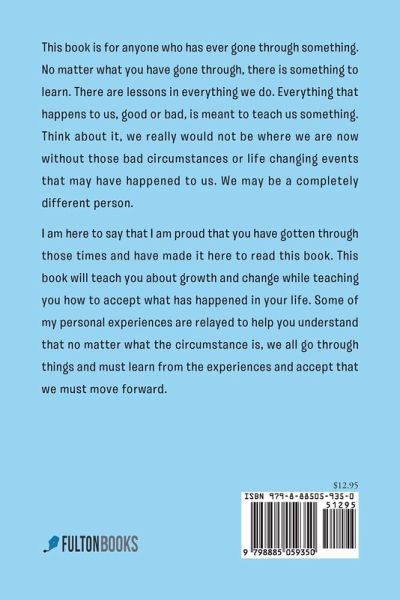 This book is for anyone who has ever gone through something. No matter what you have gone through, there is something to learn. There are lessons in everything we do. Everything that happens to us, good or bad, is meant to teach us something. Think about it, we really would not be where we are now without those bad circumstances or life changing events that may have happened to us. We may be a completely different person. I am here to say that I am proud that you have gotten through those times and have made it here to read this book. This book will teach you about growth and change while teaching you how to accept what has happened in your life. Some of my personal experiences are relayed to help you understand that no matter what the circumstance is, we all go through things and must learn from the experiences and accept that we must move forward.