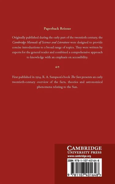 Originally published during the early part of the twentieth century, the Cambridge Manuals of Science and Literature were designed to provide concise introductions to a broad range of topics. They were written by experts for the general reader and combined a comprehensive approach to knowledge with an emphasis on accessibility. First published in 1914, R. A. Sampson's book The Sun presents an early twentieth-century overview of the facts, theories and astronomical phenomena relating to the Sun.