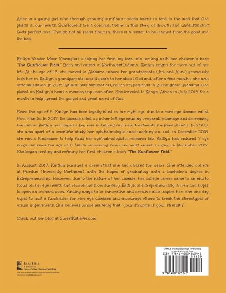 Kaitlyn Vander Meer (Corsiglia) is taking her first big leap into writing with her children's book "The Sunflower Field." Since the age of 6, Kaitlyn has been legally blind in her right eye, due to a rare eye disease called Pars Planitis. Kaitlyn has endured 7 eye surgeries since the age of 6. While recovering from her most recent surgery in November 2017, she began writing and refining her first children's book. She believes wholeheartedly that "your struggle is your strength".