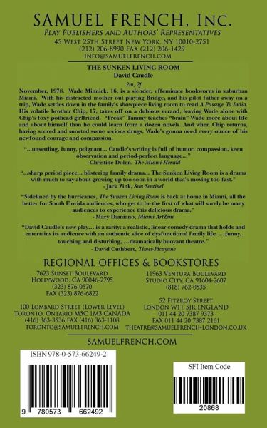 2m, 2f November, 1978. Wade Minnick, 16, is a slender, effeminate bookworm in suburban Miami. With his distracted mother out playing Bridge, and his pilot father away on a trip, Wade settles down in the family's showpiece living room to read A Passage To India. His volatile brother Chip, 17, takes off on a dubious errand, leaving Wade alone with Chip's foxy pothead girlfriend. "Freak" Tammy teaches "brain" Wade more about life and about himself than he could learn from a dozen novels. And wh