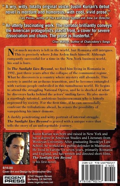 Not much mystery is left in the world, but Romania still intrigues. This is precisely where John Arden finds himself. Although rampantly successful for a time in the New York business world, his soul is bare. "In The Sunlight Lies Beyond," we find him living in Romania in 1992, just three years after the collapse of the communist regime. What he discovers is a country where mystery still abounds. The society is amidst an arduous transition and he becomes entangled with various people embroiled in this tumultuous world. He begins to attend the struggling National Opera and he is shocked at what he discovers lurks behind the actors' smiling faces. He also meets a startlingly talented, ambitious businesswoman who is bitterly repressed by society. For the first time, if he can successfully confront the tribulations ahead, he senses the possibility of vanquishing his inner demons.