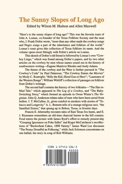 "Here's to the sunny slopes of long ago," was the favorite toast of John A. Lomax, co-founder of the Texas Folklore Society, which lends its name to this volume which opens with J. Frank Dobie's sketch of Lomax. It is followed by Lomax's own "Cowboy Lingo," found among Dobie's papers, and by two other articles on the cowboy by men whose names sound out in the history of southwestern writing--Eugene Manlove Rhodes and Andy Adams. The theme of the cowboy and the West is further pursued in "The Cowboy Code," by Paul Patterson, "The Cowboy Enters the Movies," by Mody Boatright, "Billy the Kid, Hired Gun or Hero," by John O. West, and "Laureates of the Western Range," by Everett A. Gillis. Next comes William D. Wittliff's collection of passages on folklore from Dobie's writings. The second half of the volume includes the history of two folktales, a strange religious sect, tales of East Texas fox hunts, an old-time charcoal burner, poke sallet, and folksongs, among others. Includes a special portfolio of J. Frank Dobie photographs.