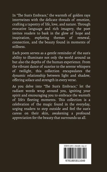 In "The Sun's Embrace," the warmth of golden rays intertwines with the delicate threads of emotion, crafting a tapestry of life, love, and nature. Through evocative language and rich imagery, the poet invites readers to bask in the glow of hope and inspiration, exploring themes of renewal, connection, and the beauty found in moments of stillness. Each poem serves as a gentle reminder of the sun's ability to illuminate not only the world around us but also the depths of the human experience. From the vibrant dance of sunrise to the serene whispers of twilight, this collection encapsulates the dynamic relationship between light and shadow, offering solace and strength in every verse. As you delve into "The Sun's Embrace," let the radiant words wrap around you, igniting your spirit and encouraging you to embrace the warmth of life's fleeting moments. This collection is a celebration of the magic found in the everyday, urging readers to step outside and feel the sun's caress on their skin, awakening a profound appreciation for the beauty that surrounds us all.