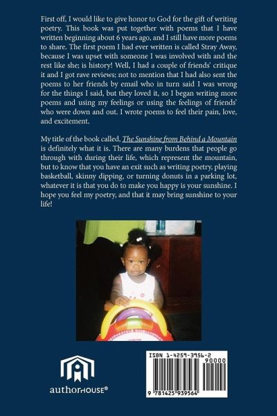 First off I would give honor to God for the gift of writing poetry. This book was put together with poems that I have written beginning about 6 years ago, and I still have more poems to share. The first poem I had ever written is called Stray Away, because I was upset with someone I was involved with and the rest like she; is history! Well, I had a couple of friends' critique it and I got rave reviews; not to mention that I had also sent the poems to her friends by email who in turn said I was wrong for the things I said, but they loved it, so I began writing more poems and using my feelings or using the feelings of friends' who were down and out. I wrote poems to feel their pain, love, and excitement. My title of the book called, The Sunshine from Behind the Mountain is definitely what it is. There are many burdens that people go through with during their life, which represent the mountain, but to know that you have an exit such as writing poetry, playing basketball, skinny dipping, or turning donuts in a parking lot, whatever it is that you do to make you happy is your sunshine. I hope you feel my poetry, and that it may bring sunshine to your life!