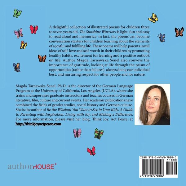 A delightful collection of illustrated poems for children three to seven years old, The Sunshine Warriors is light, fun and easy to read aloud and memorize. In fact, the poems can become conversation starters for children learning about the elements of a joyful and fulfilling life. These poems will help parents instill ideas of self-love and self-worth in their children by promoting healthy habits, excitement for learning and a positive outlook on life. Author Magda Tarnawska Senel also conveys the importance of gratitude, looking at life through the prism of opportunities (rather than failures), always doing our individual best, and nurturing respect for other people and for nature.