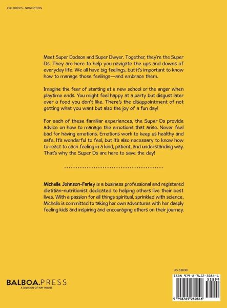 Meet Super Dodson and Super Dwyer. Together, they're the Super Ds. They are here to help you navigate the ups and downs of everyday life. We all have big feelings, but it's important to know how to manage those feelings-and embrace them. Imagine the fear of starting at a new school or the anger when playtime ends. You might feel happy at a party but disgust later over a food you don't like. There's the disappointment of not getting what you want but also the joy of a fun day! For each of these familiar experiences, the Super Ds provide advice on how to manage the emotions that arise. Never feel bad for having emotions. Emotions work to keep us healthy and safe. It's wonderful to feel, but it's also necessary to know how to react to each feeling in a kind, patient, and understanding way. That's why the Super Ds are here to save the day!
