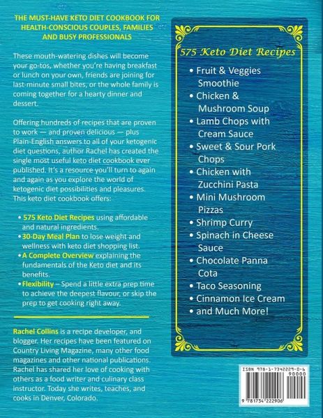 WHILE OTHER KETO COOKBOOKS are poorly written, have no recipe index, no meal plan and shopping list, lots of editing errors, incomplete instructions, plain and uninspiring recipes, or simply recipes that are overcomplicated, The Super Easy Keto Cookbook by Rachel Collins features the best variety of well-thought-out and well-tested recipes you should expect with nutrition facts for every recipe in the book, comes with the well-structured recipe index and 30-day meal plan for weight loss including shopping list. WE ARE REAL PEOPLE who use our own recipes for our families. We expect the best for our families and want the same for yours. The way to the hearts of your man and family is through good food on the table. Meal times can be such wonderful of times when you have the most fantastic of food on the table. We hope this cookbook will be a great help for yourself and your family. We cut no corner in our boks and will cut no corners in our support of you. We know you're a big deal and we'll only provide you with the finest product and service around or your MONEY BACK! In the Super Easy Keto Cookbook Rachel has handpicked her most-requested recipes that will surely become mainstays in your home too. This keto cookbook offers: 575 Keto Diet Recipes using affordable and natural ingredients. 30-Day Meal Plan to lose weight and wellness with keto diet shopping list. Flexibility —Spend a little extra prep time to achieve the deepest flavor, or skip the prep to get cooking right away. "I just received my copy of Rachel's book!!! I own several keto books, this one is my favorite so far. It is so easy to understand, and to the point. I ordered another copy for a friend!!! Thank you Rachel for such an easy and well written book." — Michelle White, Writer and Editor Would You Like to Know More? Scroll to the top and Add this amazing Keto Cookbook to your cart and Get your copy NOW!