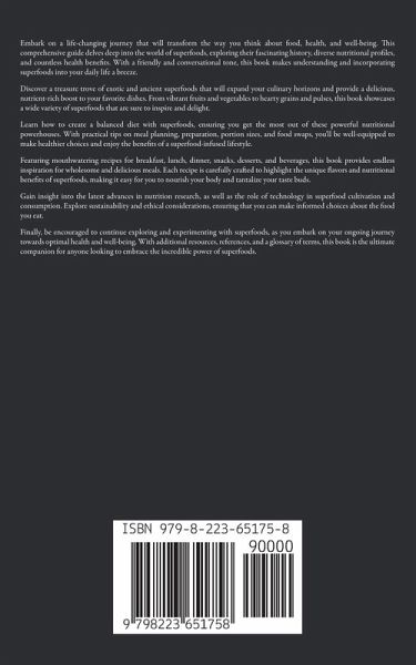 Embark on a life-changing journey that will transform the way you think about food, health, and well-being. This comprehensive guide delves deep into the world of superfoods, exploring their fascinating history, diverse nutritional profiles, and countless health benefits. With a friendly and conversational tone, this book makes understanding and incorporating superfoods into your daily life a breeze. Discover a treasure trove of exotic and ancient superfoods that will expand your culinary horizons and provide a delicious, nutrient-rich boost to your favorite dishes. From vibrant fruits and vegetables to hearty grains and pulses, this book showcases a wide variety of superfoods that are sure to inspire and delight. Learn how to create a balanced diet with superfoods, ensuring you get the most out of these powerful nutritional powerhouses. With practical tips on meal planning, preparation, portion sizes, and food swaps, you'll be well-equipped to make healthier choices and enjoy the benefits of a superfood-infused lifestyle. Featuring mouthwatering recipes for breakfast, lunch, dinner, snacks, desserts, and beverages, this book provides endless inspiration for wholesome and delicious meals. Each recipe is carefully crafted to highlight the unique flavors and nutritional benefits of superfoods, making it easy for you to nourish your body and tantalize your taste buds. Gain insight into the latest advances in nutrition research, as well as the role of technology in superfood cultivation and consumption. Explore sustainability and ethical considerations, ensuring that you can make informed choices about the food you eat. Finally, be encouraged to continue exploring and experimenting with superfoods, as you embark on your ongoing journey towards optimal health and well-being. With additional resources, references, and a glossary of terms, this book is the ultimate companion for anyone looking to embrace the incredible power of superfoods.