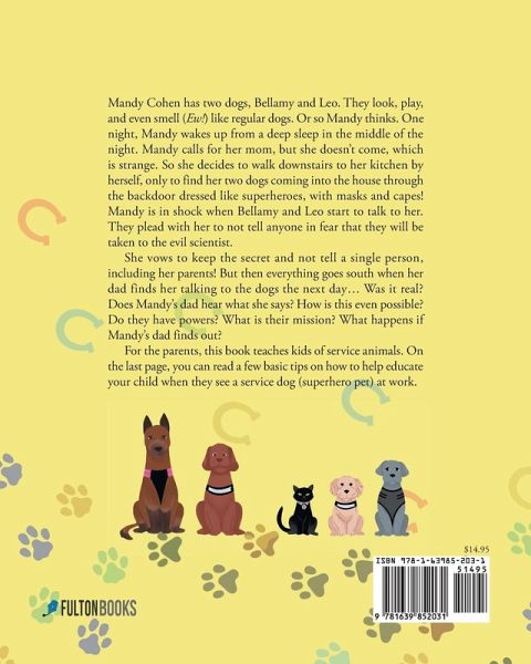 Mandy Cohen has two dogs, Bellamy and Leo. They look, play, and even smell (Ew!) like regular dogs. Or so Mandy thinks. One night, Mandy wakes up from a deep sleep in the middle of the night. Mandy calls for her mom, but she doesn't come, which is strange. So she decides to walk downstairs to her kitchen by herself, only to find her two dogs coming into the house through the backdoor dressed like superheroes, with masks and capes! Mandy is in shock when Bellamy and Leo start to talk to her. They plead with her to not tell anyone in fear that they will be taken to the evil scientist. She vows to keep the secret and not tell a single person, including her parents! But then everything goes south when her dad finds her talking to the dogs the next day... Was it real? Does Mandy's dad hear what she says? How is this even possible? Do they have powers? What is their mission? What happens if Mandy's dad finds out? For the parents, this book teaches kids of service animals. On the last page, you can read a few basic tips on how to help educate your child when they see a service dog (superhero pet) at work.