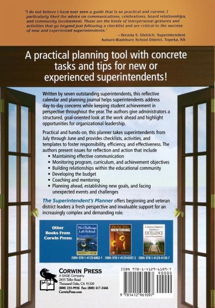 A practical planning tool with concrete tasks and tips for new or experienced superintendents! Written by seven outstanding superintendents, this reflective calendar and planning journal helps superintendents address day-to-day concerns while maintaining a focus on increasing student achievement. Month-to-month, this planner takes administrators from July through June, provides checklists and templates for overlaying timelines with events, and presents issues for reflection and action that include: maintaining visibility and effective communication monitoring program, curriculum, and achievement objectives building relationships among the educational community developing the budget coaching and mentoring planning ahead, establishing new goals, and facing unexpected events and challenges