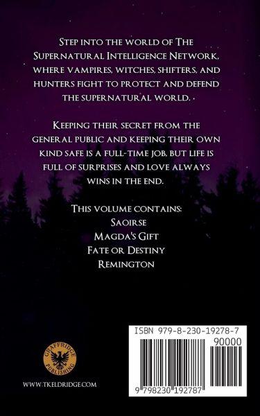 Step into the world of The Supernatural Intelligence Network, where vampires, witches, shifters, and hunters fight to protect and defend the supernatural world. Keeping their secret from the general public and keeping their own kind safe is a full-time job, but life is full of surprises and love always wins in the end. This volume contains: Saoirse Magda's Gift Fate or Destiny Remington