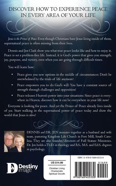 Discover How to Experience Peace in Every Area of Your Life Jesus is the Prince of Peace. Even though Christians have Jesus living inside of them, supernatural peace is often missing from their lives. Dennis and Jen Clark show you what true peace looks like and how to enjoy it. Peace is not a problem-free life. Instead, it is God’s power that gives you strength, joy, purpose, and victory, even when you are going through difficult times. You will learn how: Peace gives you new options in the middle of circumstances: Don’t be overwhelmed by the trials of life anymore! Peace empowers you to do God’s will: You have a constant source of strength through challenges and opposition! Peace releases Heaven’s power into your situations: Since peace is everywhere in Heaven, discover how it can be everywhere in your life now! Everyone is looking for peace. And yet the Prince of Peace already lives inside of you. Start walking in the supernatural power of peace today and show the world that Jesus is alive!