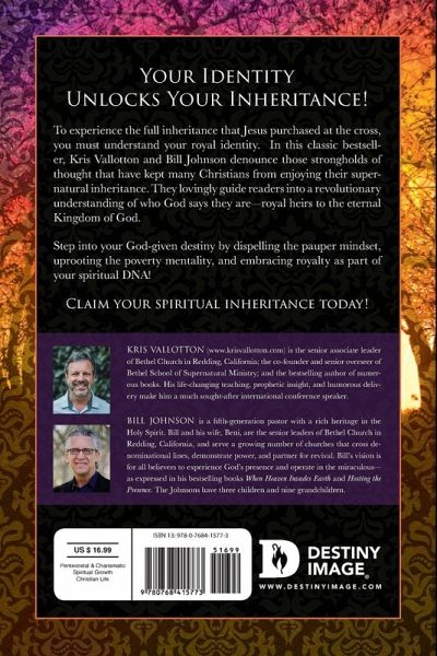 Your Identity Unlocks Your Inheritance! To experience the full inheritance that Jesus purchased at the cross, you must understand your royal identity. In this classic bestseller, Kris Vallotton and Bill Johnson denounce those strongholds of thought that have kept many Christians from enjoying their supernatural inheritance. They lovingly guide readers into a revolutionary understanding of who God says they are—royal heirs to the eternal Kingdom of God. Step into your God-given destiny by dispelling the pauper mindset, uprooting the poverty mentality, and embracing royalty as part of your spiritual DNA! Claim your spiritual inheritance today!
