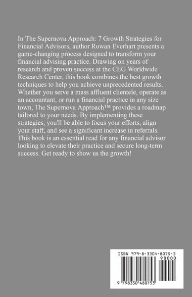 In The Supernova Approach: 7 Growth Strategies for Financial Advisors, author Rowan Everhart presents a game-changing process designed to transform your financial advising practice. Drawing on years of research and proven success at the CEG Worldwide Research Center, this book combines the best growth techniques to help you achieve unprecedented results. Whether you serve a mass affluent clientele, operate as an accountant, or run a financial practice in any size town, The Supernova Approach¿ provides a roadmap tailored to your needs. By implementing these strategies, you'll be able to focus your efforts, align your staff, and see a significant increase in referrals. This book is an essential read for any financial advisor looking to elevate their practice and secure long-term success. Get ready to show us the growth!