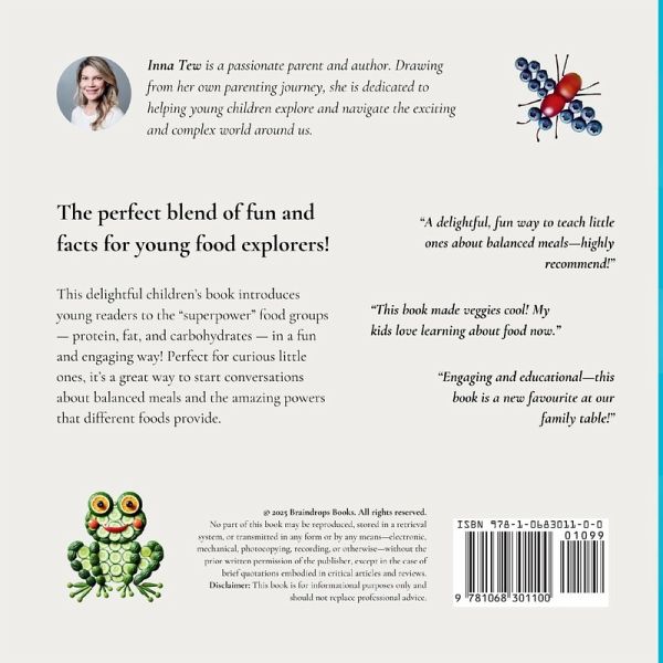 The Superpower Foods: Protein, Fat, and Carbohydrates is a fun and engaging children's book that introduces young readers to the essential food groups that fuel their bodies and help them grow strong. Through playful rhymes and vibrant, eye-catching illustrations, this book explores the power of protein, fat, and carbohydrates, showing children how each of these food groups plays a crucial role in keeping them energized, healthy, and ready to take on the world. Designed for curious minds, this book makes learning about food fun and accessible for toddlers and young children. Protein helps to build strong muscles and bones, fat provides energy and supports brain health, and carbohydrates fuel the body for movement and play. The book also introduces the importance of vegetables and fruit, emphasizing their added benefits of fiber and vitamins that support growth and boost the immune system. In addition to the delightful food discoveries, The Superpower Foods includes a special section for parents. This section offers practical tips on how to encourage children to explore new foods and build a positive relationship with what they eat. It also features family-friendly games that turn mealtimes into enjoyable, interactive experiences for the whole family, making eating together a fun adventure. With a delightful mix of real-life photos and playful food art, this book sparks imagination while promoting a balanced diet. It encourages kids to enjoy a variety of foods and to understand how eating a rainbow of colors benefits their health. Whether they're discovering the nutritional powers of everyday foods or exploring new flavors, children will develop a positive relationship with eating and an appreciation for the "superpowers" in their meals. Ideal for parents, caregivers, and educators, The Superpower Foods is a perfect addition to any young child's library, helping them understand the connection between food and their overall well-being. It offers an exciting way to begin conversations about healthy eating habits and the exciting journey of nourishing their bodies with the right foods.