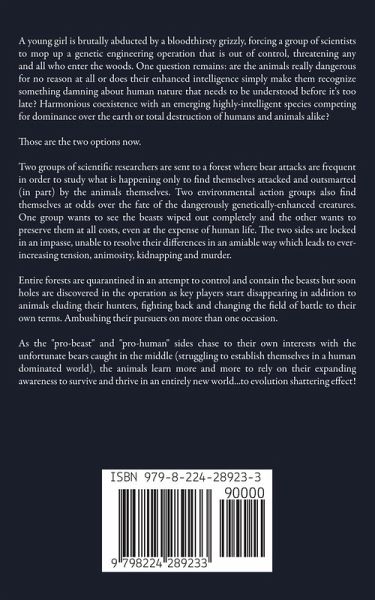 A young girl is brutally abducted by a bloodthirsty grizzly, forcing a group of scientists to mop up a genetic engineering operation that is out of control, threatening any and all who enter the woods. One question remains: are the animals really dangerous for no reason at all or does their enhanced intelligence simply make them recognize something damning about human nature that needs to be understood before it's too late? Harmonious coexistence with an emerging highly-intelligent species competing for dominance over the earth or total destruction of humans and animals alike? Those are the two options now. Two groups of scientific researchers are sent to a forest where bear attacks are frequent in order to study what is happening only to find themselves attacked and outsmarted (in part) by the animals themselves. Two environmental action groups also find themselves at odds over the fate of the dangerously genetically-enhanced creatures. One group wants to see the beasts wiped out completely and the other wants to preserve them at all costs, even at the expense of human life. The two sides are locked in an impasse, unable to resolve their differences in an amiable way which leads to ever-increasing tension, animosity, kidnapping and murder. Entire forests are quarantined in an attempt to control and contain the beasts but soon holes are discovered in the operation as key players start disappearing in addition to animals eluding their hunters, fighting back and changing the field of battle to their own terms. Ambushing their pursuers on more than one occasion. As the "pro-beast" and "pro-human" sides chase to their own interests with the unfortunate bears caught in the middle (struggling to establish themselves in a human dominated world), the animals learn more and more to rely on their expanding awareness to survive and thrive in an entirely new world...to evolution shattering effect!