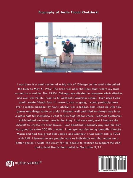 Biography of Justin Thadd Kludzinski I was born in a small section of a big city of Chicago on the south side called the Bush on May 5, 1952. The area was near the steel plant where my Dad worked as a welder. The 1950's Chicago was divided in complete ethnic districts and ours was Polish. I went to St. Michael's Grammar school. Ever since I was small I made friends fast. If I were to start a gang, I would probably have over a million members by now. I always was a leader, and I came up with new games and things to do as a kid. I listened well and tried to always stay in at a glass half full mentality. I went to CVS high school where I learned electronics which helped me when I was in the Army. I did very well, and I became the 32G20 fix crypto Pro from Dover. I got additional specialty pay and the pay was good an extra $50.00 a month. I then got married to my beautiful fiancée Maria and had two great kids Jessica and Matthew. I was really sick in 1993 with AML. I learned to see people more as individuals and that made me a better person. I wrote The Array for the people to continue to support the USA, and to hold firm in their belief in God after 9/11.