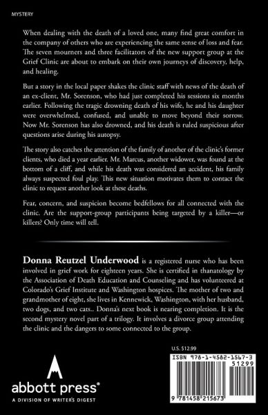 When dealing with the death of a loved one, many find great comfort in the company of others who are experiencing the same sense of loss and fear. The seven mourners and three facilitators of the new support group at the Grief Clinic are about to embark on their own journeys of discovery, help, and healing. But a story in the local paper shakes the clinic staff with news of the death of an ex-client, Mr. Sorenson, who had just completed his sessions six months earlier. Following the tragic drowning death of his wife, he and his daughter were overwhelmed, confused, and unable to move beyond their sorrow. Now Mr. Sorenson has also drowned, and his death is ruled suspicious after questions arise during his autopsy. The story also catches the attention of the family of another of the clinic's former clients, who died a year earlier. Mr. Marcus, another widower, was found at the bottom of a cliff, and while his death was considered an accident, his family always suspected foul play. This new situation motivates them to contact the clinic to request another look at these deaths. Fear, concern, and suspicion become bedfellows for all connected with the clinic. Are the support-group participants being targeted by a killer-or killers? Only time will tell.