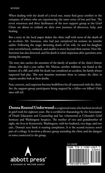When dealing with the death of a loved one, many find great comfort in the company of others who are experiencing the same sense of loss and fear. The seven mourners and three facilitators of the new support group at the Grief Clinic are about to embark on their own journeys of discovery, help, and healing. But a story in the local paper shakes the clinic staff with news of the death of an ex-client, Mr. Sorenson, who had just completed his sessions six months earlier. Following the tragic drowning death of his wife, he and his daughter were overwhelmed, confused, and unable to move beyond their sorrow. Now Mr. Sorenson has also drowned, and his death is ruled suspicious after questions arise during his autopsy. The story also catches the attention of the family of another of the clinic's former clients, who died a year earlier. Mr. Marcus, another widower, was found at the bottom of a cliff, and while his death was considered an accident, his family always suspected foul play. This new situation motivates them to contact the clinic to request another look at these deaths. Fear, concern, and suspicion become bedfellows for all connected with the clinic. Are the support-group participants being targeted by a killer-or killers? Only time will tell.