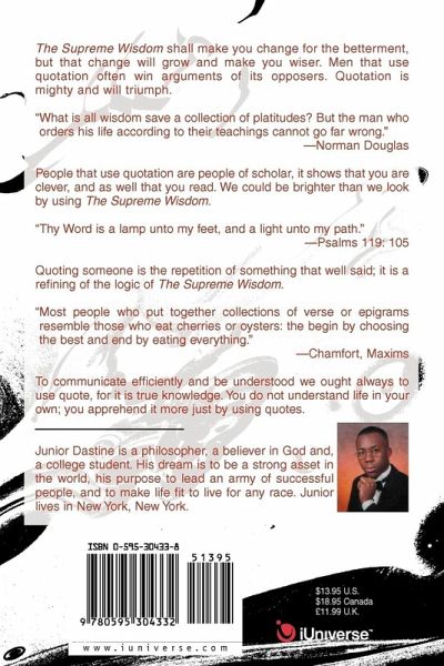 The Supreme Wisdom shall make you change for the betterment, but that change will grow and make you wiser. Men that use quotation often win arguments of its opposers. Quotation is mighty and will triumph. "What is all wisdom save a collection of platitudes? But the man who orders his life according to their teachings cannot go far wrong." --Norman Douglas People that use quotation are people of scholar, it shows that you are clever, and as well that you read. We could be brighter than we look by using The Supreme Wisdom. "Thy Word is a lamp unto my feet, and a light unto my path." --Psalms 119: 105 Quoting someone is the repetition of something that well said; it is a refining of the logic of The Supreme Wisdom. "Most people who put together collections of verse or epigrams resemble those who eat cherries or oysters: the begin by choosing the best and end by eating everything." --Chamfort, Maxims To communicate efficiently and be understood we ought always to use quote, for it is true knowledge. You do not understand life in your own; you apprehend it more just by using quotes.