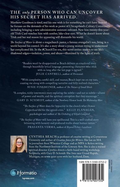 The only person who can uncover his secret has arrived. Matthew Goodman is tired, and his one wish is for something he can't have. Instead he focuses on the demands of his work as pastor of Chicagoland's Calvary Community, including bringing a new administrative assistant onboard. New hire twenty-five-year-old Trish Card watches him with somber, lake-clear eyes. What he doesn't know about Trish and her real reason for appearing will dismantle his world. The Surface of Water is about a megachurch pastor, a famous evangelist's son, living in a world beyond his control. It's also a story about a young woman trying to understand her complicated life. In the #ChurchToo era, this novel invites readers to see life's shadowed edges--isolation, power, and abuse--illumined by the light of truth.
