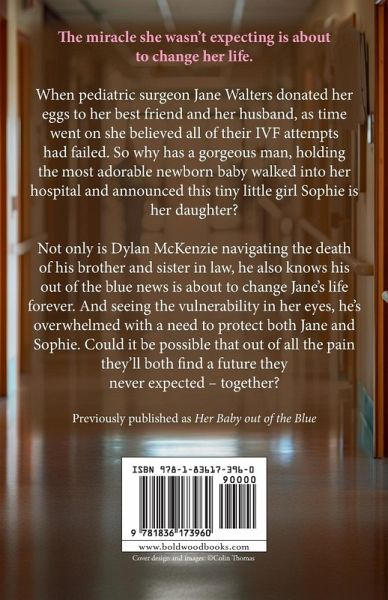 The miracle she wasn't expecting is about to change her life When pediatric surgeon Jane Walters donated her eggs to her best friend and her husband, as time went on she believed all of their IVF attempts had failed. So why has a gorgeous man, holding the most adorable newborn baby walked into her hospital and announced this tiny little girl Sophie is her daughter? Not only is Dylan McKenzie navigating the death of his brother and sister in law, he also knows his out of the blue news is about to change Jane's life forever. And seeing the vulnerability in her eyes, he's overwhelmed with a need to protect both Jane and Sophie. Could it be possible that out of all the pain they'll both find a future they never expected - together? Previously published as Her Baby out of the Blue