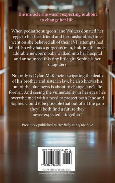 The miracle she wasn't expecting is about to change her life When pediatric surgeon Jane Walters donated her eggs to her best friend and her husband, as time went on she believed all of their IVF attempts had failed. So why has a gorgeous man, holding the most adorable newborn baby walked into her hospital and announced this tiny little girl Sophie is her daughter? Not only is Dylan McKenzie navigating the death of his brother and sister in law, he also knows his out of the blue news is about to change Jane's life forever. And seeing the vulnerability in her eyes, he's overwhelmed with a need to protect both Jane and Sophie. Could it be possible that out of all the pain they'll both find a future they never expected - together? Previously published as Her Baby out of the Blue