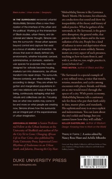 In The Surrounds renowned urbanist AbdouMaliq Simone offers a new theorization of the interface of the urban and the political. Working at the intersection of Black studies, urban theory, and decolonial and Islamic thought, Simone centers the surrounds-those urban spaces beyond control and capture that exist as a locus of rebellion and invention. He shows that even in clearly defined city environments, whether industrial, carceral, administrative, or domestic, residents use spaces for purposes they were not designed for: schools become housing, markets turn into classrooms, tax offices transform into repair shops. The surrounds, Simone contends, are where nothing fits according to design. They are where forgotten and marginalized populations invent new relations and ways of living and being, continuously reshaping what individuals and collectives can do. Focusing less on what new worlds may come to be and more on what people are creating now, Simone shows how the surrounds are an integral part of the expansiveness of urban imagination.