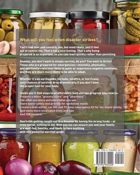 What will you feel when disaster strikes? You'll feel fear and concern, yes, but most likely, you'll feel out of control too. That's not a nice feeling. That's why being prepared is so important, so you can react quickly rather than panicking. Anyway, you don't want to simply survive, do you? You want to thrive! Those who are prepared for emergencies-mentally, physically, and spiritually-are less likely to panic or experience negative emotions, and they are much more likely to be able to adapt. Whether it's an earthquake, tornado, wildfire, or hurricane, your chances of survival drop dramatically if you don't have the proper fuel for your body. Inside you'll find steps to an affordable food storage program plus how to:Prepare a home "grocery store" and "pharmacy" Use what you store and store what you use Store water safely and provide for sanitation needs Create a first-aid kit, car kit, and 72-hour emergency kit for the whole family And many more invaluable hints and tips And 300 recipes! Don't risk getting caught out in a disaster by having the wrong foods - or even worse, nothing to eat. Now you too can ensure you and your family are well-fed, healthy, and ready to face anything with this powerful survival guide.