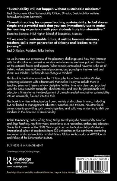"Practical and thoughtful, Rimanoczy's book invites educators to deeply reflect how to develop the sustainable mindset needed --along with the knowledge and skills-- to tackle the most pressing global issues and achieve the Sustainable Development Goals (SDGs) through a shift in 'knowing' (ecoliteracy), 'thinking' (systemic and innovative thinking) and 'being' (values, purpose). This is, indeed, highly needed." - M. Florencia Librizzi, Head of Program and Partnerships, SDG Academy, UN Sustainable Development Solutions Network (SDSN)