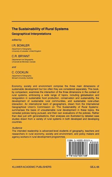 Economy, society, and environment comprise the three main dimensions of sustainable development but too often they are considered separately. This book, by comparison, examines the interaction of the three dimensions in the context of rural systems, embracing a wide range of topics, including globalisation and reregulation in sustainable food production, conservation and sustainability, the development of sustainable rural communities, and sustainable rural-urban interaction. An international team of geographers, drawn from the International Geographical Union's Commission on The Sustainability of Rural Systems, summarises the basis of unsustainable rural development in these topics, the remedial policies being pursued, and their own evaluations of the policies. Rather than deal just with generalisations, their analyses are illustrated by detailed case studies drawn from a variety of rural systems in both developed and developing countries.