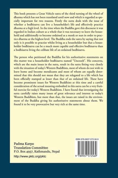 This book presents a Great Vehicle sutra of the third turning of the wheel of dharma which has not been translated until now and which is regarded as specially important for two reasons. Firstly the sutra deals with the issue of whether a bodhisatva can live a householder's life and effectively practice dharma at a high level. In the time when the Buddha gave this discourse it was regarded in Indian culture as a whole that it was necessary to leave the household and additionally to become ordained as a monk or nun in order to practice dharma at the highest level. The Buddha ends the sutra by saying that not only is it possible to practise whilst living as a householder but that a householder bodhisatva can be a much more capable and effective bodhisatva than a bodhisatva living the celibate life of an ordained bodhisatva. The person who petitioned the Buddha for his authoritative statements on this matter was a householder bodhisatva named "Uncouth". His concerns, which are the main issues in the sutra, result in the sutra fitting very closely with the situation of today's Western Buddhists, most of whom do not wish to leave home and become mendicants and most of whom are equally determined that this should not mean that they are relegated to a life which has been officially stamped as lesser than that of an ordained life. These have become prominent issues for Western Buddhists at this time and a careful consideration of the actual meaning embodied in this sutra can be a very fruitful exercise for today's Western Buddhists. I have found that investigating the sutra carefully raises many issues of great relevance and interest to today's Western Buddhists, but more than that, the issues are raised in the environment of the Buddha giving his authoritative statements about them. We found it to be very provocative but very rich at the same time.