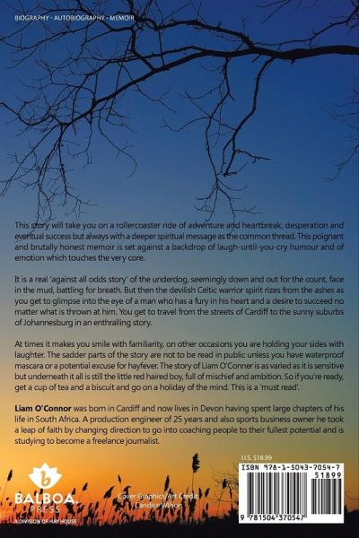 This story will take you on a rollercoaster ride of adventure and heartbreak, desperation and eventual success but always with a deeper spiritual message as the common thread. This poignant and brutally honest memoir is set against a backdrop of laugh-until-you-cry humour and of emotion which touches the very core. It is a real ‘against all odds story’ of the underdog, seemingly down and out for the count, face in the mud, battling for breath. But then the devilish Celtic warrior spirit rizes from the ashes as you get to glimpse into the eye of a man who has a fury in his heart and a desire to succeed no matter what is thrown at him. You get to travel from the streets of Cardiff to the sunny suburbs of Johannesburg in an enthralling story. At times it makes you smile with familiarity, on other occasions you are holding your sides with laughter. The sadder parts of the story are not to be read in public unless you have waterproof mascara or a potential excuse for hayfever. The story of Liam O’Conner is as varied as it is sensitive but underneath it all is still the little red haired boy, full of mischief and ambition. So if you’re ready, get a cup of tea and a biscuit and go on a holiday of the mind. This is a ‘must read’.