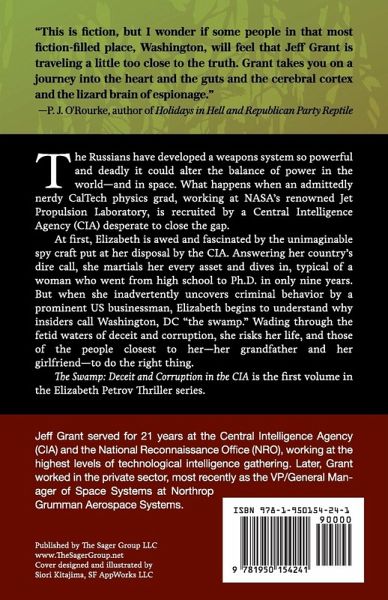 An Elizabeth Petrov Thriller Book 1 The Russians have developed a weapons system so powerful and deadly it could alter the balance of power in the world-and in space. What happens when an admittedly nerdy CalTech physics grad, a former model rocket enthusiast turned Ph.D., working at NASA's renowned Jet Propulsion Laboratory in sunny Pasadena, is recruited by a Central Intelligence Agency (CIA) desperate to close the gap? Dr. Elizabeth Petrov was brought to the US as a toddler from Russia by her grandfather and speaks the language like a native. Her unique combination of birthright, education, and experience studying the field of hypersonic flight, where spacecraft can reach speeds over five times the speed of sound, brings her country calling. From all indications, the Russian system will soon be operational, a fact too chilling to even entertain. At first, Elizabeth is awed and fascinated by the unimaginable spy craft put at her disposal by the CIA. Answering her country's dire call, she martials her every asset and dives in, typical of a woman who went from high school to Ph.D. in only nine years. But when she inadvertently uncovers criminal behavior by a prominent US businessman, Elizabeth begins to understand why insiders call Washington, DC "the swamp." Wading through the fetid waters of deceit and corruption, she risks her life, and those of the people closest to her-her grandfather and her girlfriend-to do the right thing. The Swamp: Deceit and Corruption in the CIA is the first volume in the Elizabeth Petrov Thriller series, written by Jeff Grant, who served for 21 years at the CIA and the National Reconnaissance Office (NRO). While at the CIA, Grant worked at the highest levels of technological intelligence gathering. After leaving government service, Grant worked in the private sector, most recently as the VP/General Manager of Space Systems at Northrop Grumman Aerospace Systems. Prior to publication, The Swamp was screened by the CIA and approved for release.