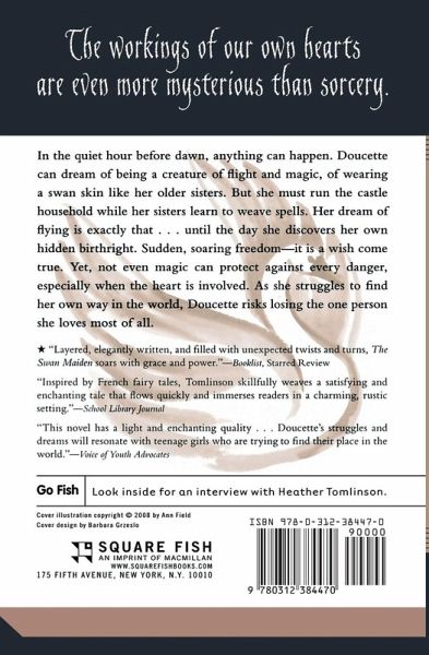In the quiet hour before dawn, anything can happen. Doucette can dream of being a creature of flight and magic, of wearing a swan skin like her older sisters. But she must run the castle household while her sisters learn to weave spells. Her dream of flying is exactly that . . . until the day she discovers her own hidden birthright. Sudden, soaring freedom-it is a wish come true. Yet, not even magic can protect against every danger, especially when the heart is involved. As she struggles to find her own way in the world, Doucette risks losing the one person she loves most of all.