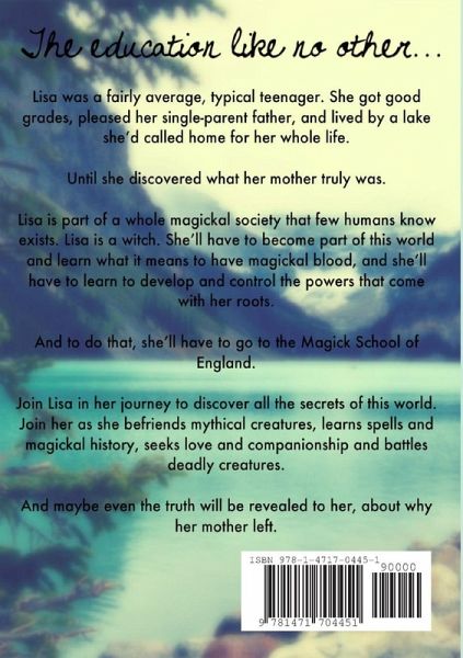 Lisa was a fairly average, typical teenager. She got good grades, pleased her single-parent father, and lived by a lake she'd called home for her whole life. Until she discovered what her mother truly was. Lisa is part of a whole magickal society that few humans know exists. Lisa is a witch. She'll have to become part of this world and learn what it means to have magickal blood, and she'll have to learn to develop and control the powers that come with her roots. And to do that, she'll have to go to the Magick School of England. Join Lisa in her journey to discover all the secrets of this world. Join her as she befriends mythical creatures, learns spells and magickal history, seeks love and companionship and battles deadly creatures. And maybe even the truth will be revealed to her, about why her mother left.