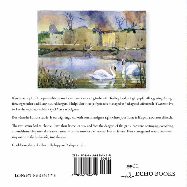 If you're a couple of European white swans, it's hard work surviving in the wild - finding food, bringing up families, getting through freezing weather and facing natural dangers. It helps a lot though if you have managed to find a good safe stretch of water to live in, like the moat around the city of Ypres in Belgium. But when the humans suddenly start fighting a war with bombs and guns right where your home is, life gets a lot more difficult. The two swans had to choose: leave their home, or stay and face the dangers of the guns that were destroying everything around them. They took the brave course and carried on with their natural lives under fire. Their courage and beauty became an inspiration to the soldiers fighting the war. Could something like that really happen? Perhaps it did...