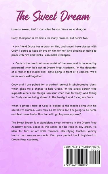 Cody Thompson is off-limits to me. 1. My friend Grace has a crush on him. 2. He's the breakout male model of the year and a paparazzi magnet. 3. I hate being in front of cameras. Now, Cody and I are paired for a portrait project in photography class. This gives me a chance to be a sweet friend and help Grace get a date to prom with him. But things turn sour. Why? Because we fall for each other. But caring for Cody means being shoved in the limelight and facing my fears. When a photo I take of Cody is leaked to the media, along with the secret which could destroy his career, I'm blamed. Cody may be off-limits, but I'm going to test the limits. How far will I go to prove my love? The Sweet Dream is a standalone sweet romance in the Dream Prep Academy series. Books in this series can be read in any order. It's ideal for fans of off-limits romance, electrifying touches, yummy treats, and swoony moments. Find your perfect book boyfriend at Dream Prep Academy.