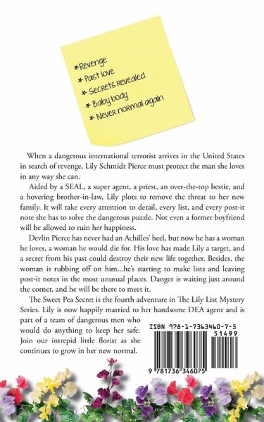 When a dangerous international terrorist arrives in the United States in search of revenge, Lily Schmidt Pierce must protect the man she loves in any way she can. Aided by a SEAL, a super agent, a priest, an over-the-top bestie, and a hovering brother-in-law, Lily plots to remove the threat to her new family. It will take every attention to detail, every list, and every post-it note she has to solve the dangerous puzzle. Not even a former boyfriend will be allowed to ruin her happiness. Devlin Pierce has never had an Achilles' heel, but now he has a woman he loves, a woman he would die for. His love has made Lily a target, and a secret from his past could destroy their new life together. Besides, the woman is rubbing off on him...he's starting to make lists and leaving post-it notes in the most unusual places. Danger is waiting just around the corner, and he will be there to meet it. The Sweet Pea Secret is the fourth adventure in The Lily List Mystery Series. Lily is now happily married to her handsome DEA agent and is part of a team of dangerous men who would do anything to keep her safe. Join our intrepid little florist as she continues to grow in her new normal.