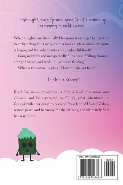 One night, Guig (pronounced "Jooj") wakes up screaming in cold sweat. What a nightmare she's had!! Her mom tries to get her back to sleep by telling her a story about a magical place where everyone is happy, and the inhabitants are all colourful foods! Guig suddenly and unexpectedly finds herself falling through a bright tunnel and lands in... cupcake frosting! What is this amazing place? How did she get here? Is this a dream? Read "The Sweet Revolution: A Tale of Food, Friendship, and Freedom" and be captivated by Guig's great adventures in Cupcakeville, her quest to become President of United Cakes, restore peace and harmony for the citizens, and ultimately find her way home.