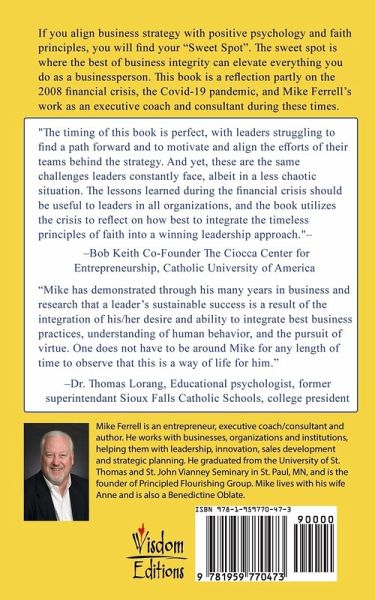 If you align business strategy with positive psychology and faith principles, you will find your "Sweet Spot". The sweet spot is where the best of business integrity can elevate everything you do as a businessperson. This book is a reflection partly on the 2008 financial crisis, the Covid-19 pandemic, and Mike Ferrel's work as an executive coach and consultant during these times. "Whether it's a financial crisis or a global pandemic the principles in Sweet Spot will help you survive and thrive" ""The timing of this book is perfect, with leaders struggling to find a path forward and to motivate and align the efforts of their teams behind the strategy. And yet, these are the same challenges leaders constantly face, albeit in a less chaotic situation. The lessons learned during the financial crisis should be useful to leaders in all organizations, and the book utilizes the crisis to reflect on how best to integrate the timeless principles of faith into a winning leadership approach."" -Bob Keith Co-Founder The Ciocca Center For Entrepreneurship, Catholic University of America "Mike has demonstrated through his many years in business and research that a leader's sustainable success is a result of the integration of his/her desire and ability to integrate best business practices, understanding of human behavior, and the pursuit of virtue. One does not have to be around Mike for any length of time to observe that this is a way of life forhim". -Dr. Thomas Lorang, Educational psychologist, former Superintendent Sioux Falls Catholic Schools, college president, leadership coach and organization behavior consultant.
