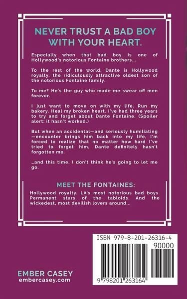 A sizzling standalone romance by USA Today bestseller Ember Casey. Never trust a bad boy with your heart. Especially when that bad boy is one of Hollywood's notorious Fontaine brothers... Ashlyn just wants to move on with her life. Run her bakery. Heal her broken heart. She's had three years to try and forget Dante Fontaine. To the rest of the world, Dante is Hollywood royalty, the ridiculously attractive oldest son of the notorious Fontaine family. To Ashlyn? He's the guy who made her swear off men forever. But when an accidental--and humiliating--encounter brings him back into her life, Ashlyn realizes that no matter how hard she's tried to forget him, Dante definitely hasn't forgotten her. …and this time, he's not going to let her go. Meet the Fontaines: Hollywood royalty. L.A.'s most notorious bad boys. Permanent stars of the tabloids. And the wickedest, most devilish lovers around... THE FONTAINES SERIES: Book 0 - The Secret to Seduction (Felicia Liddle + Roman Everet) Book 1 - The Sweet Taste of Sin (Dante Fontaine + Ashlyn Worth) Book 2 - The Lies Between the Lines (Luca Fontaine + Emilia Torres) Book 3 - The Mystery of You (Rafe Fontaine + Edie Marshall) Book 4 - The Thrill of Temptation (Orlando Fontaine + Maggie Blankenship)