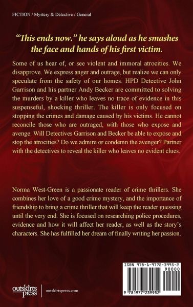 Some of us hear of, or see violent and immoral atrocities. We disapprove. We express anger and outrage, but realize we can only speculate from the safety of our homes. HPD Detective John Garrison and his partner Andy Becker are committed to solving the murders by a killer who leaves no trace of evidence in this suspenseful, shocking thriller. The killer is only focused on stopping the crimes and damage caused by his victims. He cannot reconcile those who are outraged, with those who expose and avenge. Will Detectives Garrison and Becker be able to expose and stop the atrocities? Do we admire or condemn the avenger? Partner with the detectives to reveal the killer who leaves no evident clues.