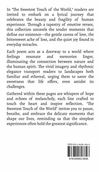 In "The Sweetest Touch of the World," readers are invited to embark on a lyrical journey that celebrates the beauty and fragility of human experience. Through a tapestry of emotive verses, this collection unravels the tender moments that define our existence-the gentle caress of love, the bittersweet ache of loss, and the quiet joy found in everyday miracles. Each poem acts as a doorway to a world where feelings resonate and memories linger, illuminating the connection between nature and the human spirit. The vivid imagery and rhythmic elegance transport readers to landscapes both familiar and ethereal, urging them to savor the sweetness that life offers, even amidst its challenges. Gathered within these pages are whispers of hope and echoes of melancholy, each line crafted to touch the heart and inspire reflection. "The Sweetest Touch of the World" invites you to pause, breathe, and embrace the delicate moments that shape our lives, reminding us that the simplest experiences often hold the greatest significance.