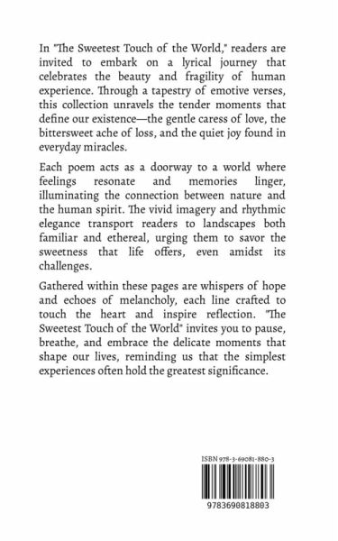 In "The Sweetest Touch of the World," readers are invited to embark on a lyrical journey that celebrates the beauty and fragility of human experience. Through a tapestry of emotive verses, this collection unravels the tender moments that define our existence-the gentle caress of love, the bittersweet ache of loss, and the quiet joy found in everyday miracles. Each poem acts as a doorway to a world where feelings resonate and memories linger, illuminating the connection between nature and the human spirit. The vivid imagery and rhythmic elegance transport readers to landscapes both familiar and ethereal, urging them to savor the sweetness that life offers, even amidst its challenges. Gathered within these pages are whispers of hope and echoes of melancholy, each line crafted to touch the heart and inspire reflection. "The Sweetest Touch of the World" invites you to pause, breathe, and embrace the delicate moments that shape our lives, reminding us that the simplest experiences often hold the greatest significance.